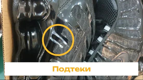 Каждый бренд устанавливает свои нормативы и допуски для производства. Самое частое допустимое расхождение, которое клиенты ошибочно принимают за брак — средняя клеевая полоска вдоль подошвы считается нормой в пределах 1–1,5 мм. А в некоторых моделях Adidas и Nike с широкой подошвой проклейка может быть толще – вплоть до 3 мм.