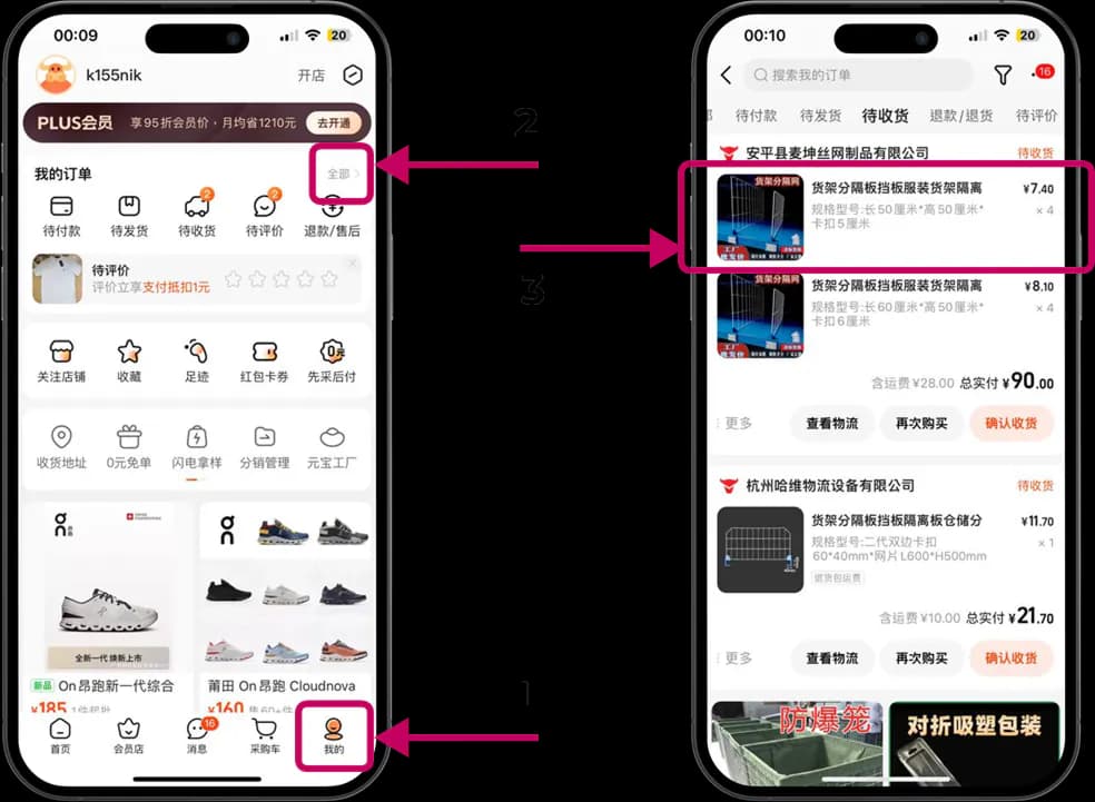 Перейдите в личный кабинет 1688 (иконка человечек) (1), далее – зайдите в данные блока «История заказов» (2), после чего в списке выберите товар, который необходимо вернуть (3)